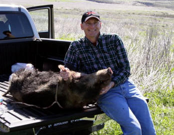Saturday morning arrived after a good night sleep and I felt fine. I drove out to the base of the mountain and Ben met me there. Ben got in my truck and we drove to the area where I shot at the pig. I pointed toward the direction I shot and Ben took off. He looked for about 10 minutes and then moved further down hill. A few minutes latter, Ben waved and pointed down in the waist high green weeds. He also called me on the cell phone to confirm that he found my pig. No wonder I couldn't see that pig after I shot. As it turns out, that pig dropped right in his tacks, he never knew what hit him.